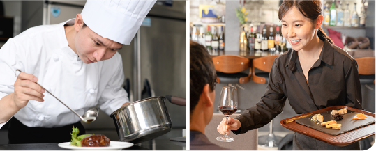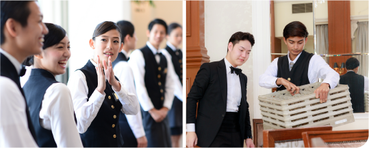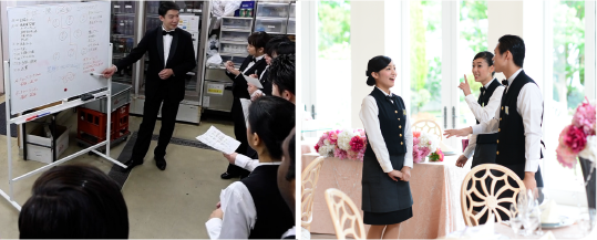 サービス品質の向上を目指し、宴会や婚礼サービスを通じて現場での育成を行います。OJT(On the Job Training)により、実務経験を重ねた人材を育てていきます。
